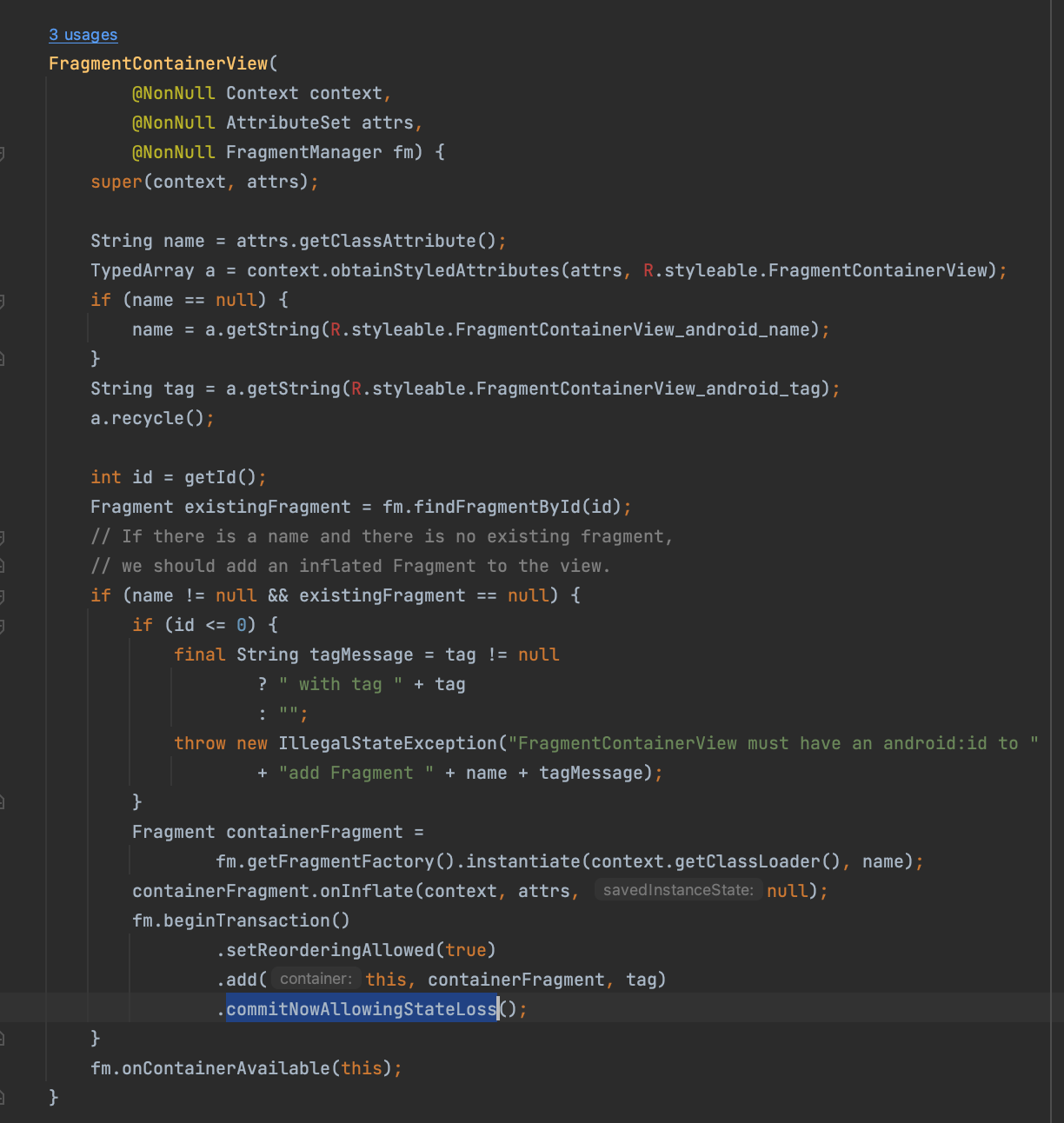 또한 FragmentContainerView 를 사용하게 되면, 내부에서 상태 저장 상관 없이 사용하도록 강제하고 있습니다.